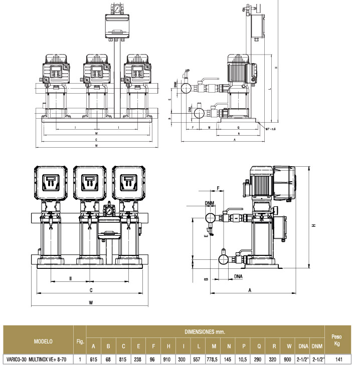 El VARIO 3 es un dispositivo electrónico que puede variar la frecuencia de la bomba eléctrica. Integrado directamente en el motor, es posible ajustar la velocidad para que el usuario mantenga siempre la misma presión al cambiar la demanda de agua. Cuando la presión del sistema car por debajo del umbral establecido, el módulo inicia la primera bomba del grupo para restablecer la presión del punto de ajuste; la velocidad de rotación de la bomba varía de acuerdo con la demanda de agua, por lo que a mayor demanda tendrá una mayor velocidad hasta alcanzar el máximo establecimiento; luego, si la planta está realizando un mayor rendimiento, el módulo iniciará la segunda y luego la tercera bomba para mantener estable la presión.